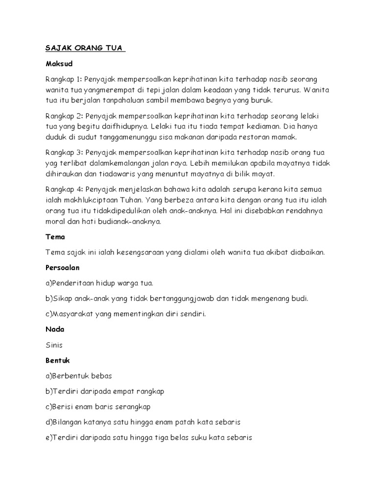 20052015 Sajak Orang Tua Maksud sajak. Penyajak mempersoalkan keprihatinan kita terhadap nasib seorang wanita tua yang merempat di tepi jalan dalam keadaan yang tidak terurus. Tapi sebenarnya Negara itu rumah Dan rakyat ahli keluarganya Mungkin rumah kita ini sudah usang 49 tahun usianya dan ada yang bertanya Apa perlunya diagungkan rumah yang usang.